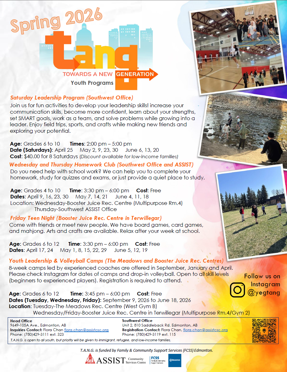 *There will be no drop-in volleyball from October 14 to December 9, 2025. In partnership with Volleyball Alberta, we will be offering a FREE 8-week Volleyball and Youth Leadership Camp. Each week will include a 45 minute life skills learning session led by T.A.N.G. staff followed by 1.25 hours of skills/technique practice and game play led by professional volleyball coaches. Must register to attend. Limited spots available.
